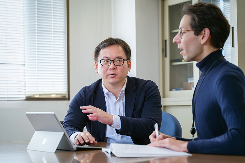 Yamaguchi in discussion with a fellow researcher in the lab. WPI-ASHBi provides an environment that encourages spontaneous communication across disciplines.