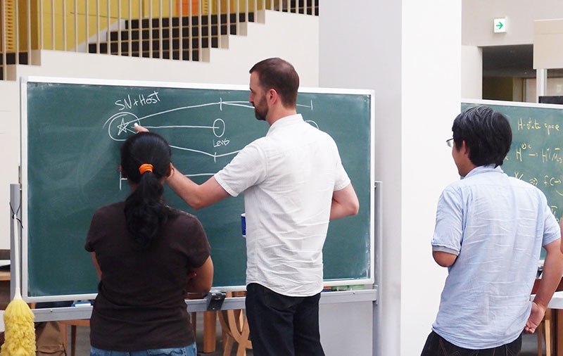 Kavli IPMU, WPI has blackboards in the halls for on-the-spot collaboration. Here Quimby discusses ideas with two colleagues, 2014. (Photo: Kavli IPMU, WPI)